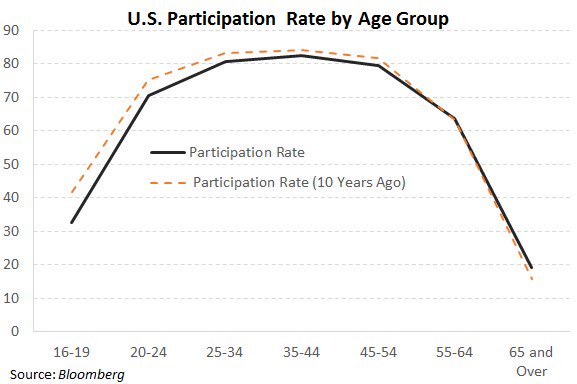 Here’s another way of looking at the same data. It’s labor force participation by age. The lines don’t seem that far apart, but a 3-4 percentage point decline across age groups adds up to millions of people no longer productively employed.